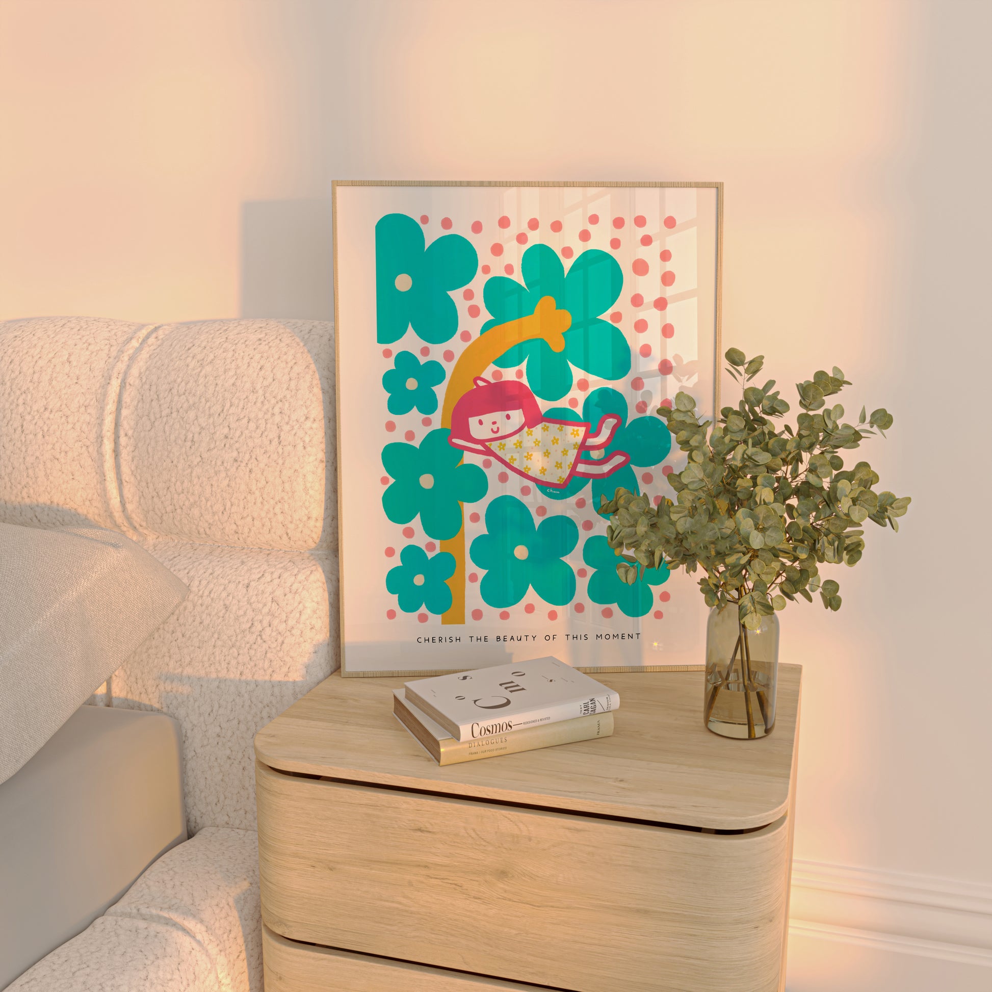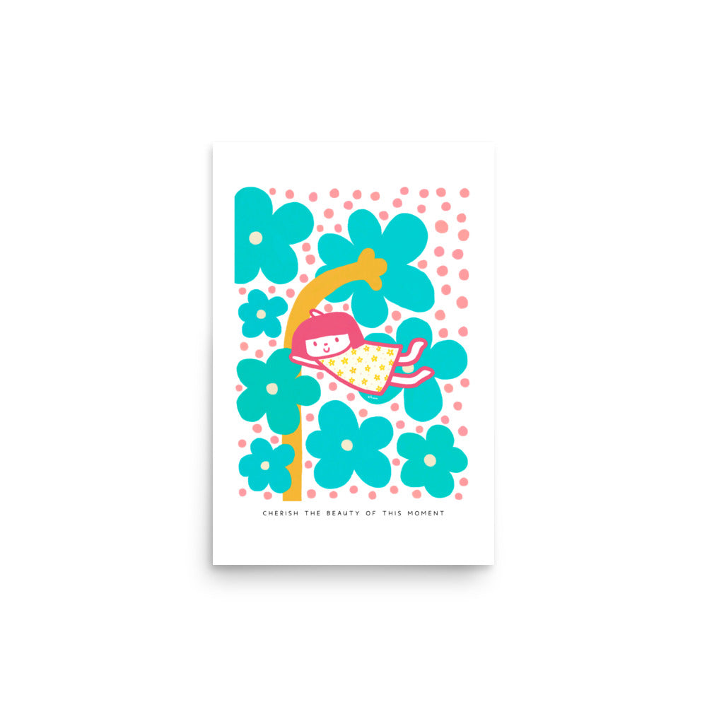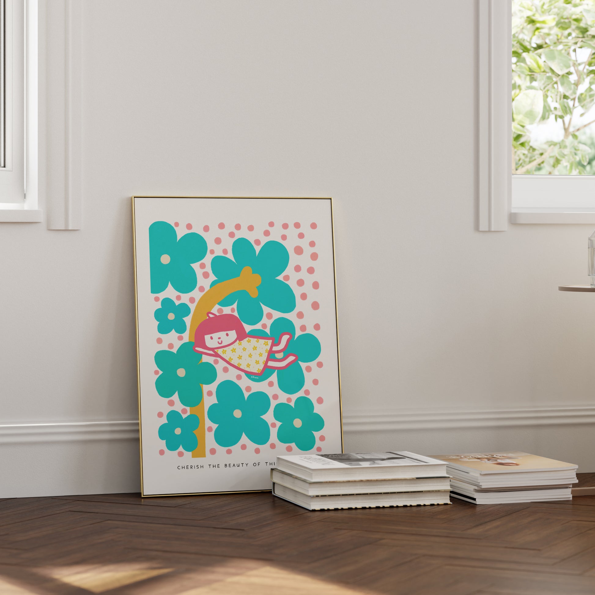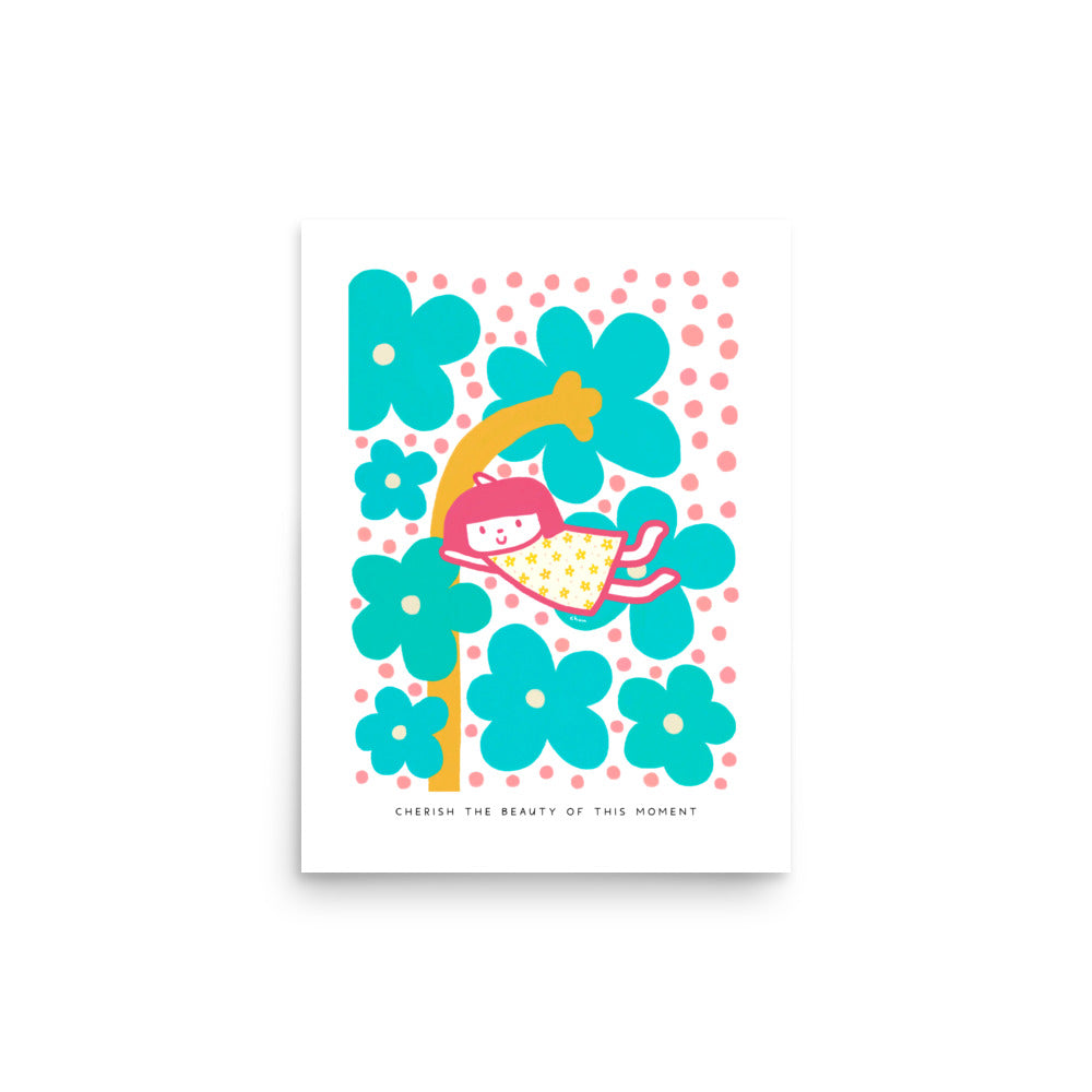 Enrich your space with the "Cherish the Beauty of This Moment" Poster. This high-quality print showcases a whimsical design featuring a cheerful girl lounging on a branch amidst large, vibrant flowers and playful polka dots.