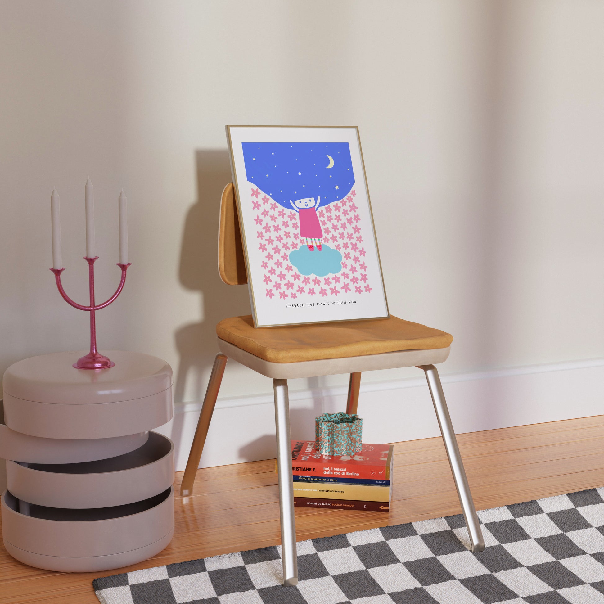 Bring inspiration to your space with the "Embrace the Magic Within You" Poster. This high-quality print showcases a whimsical design featuring a cheerful girl standing on a pink cloud under a starry night sky with a crescent moon.