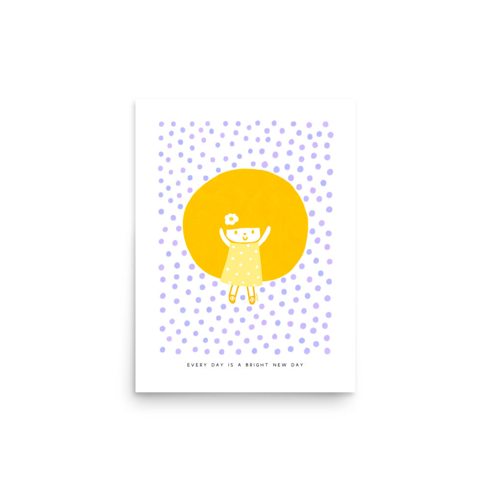 Infuse your space with joy and inspiration with the "Every Day is a Bright New Day" Poster. This high-quality print showcases a cheerful design featuring a happy girl in a yellow dress, standing against a bright yellow sun and surrounded by playful purple polka dots.
