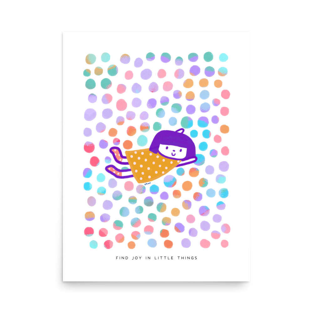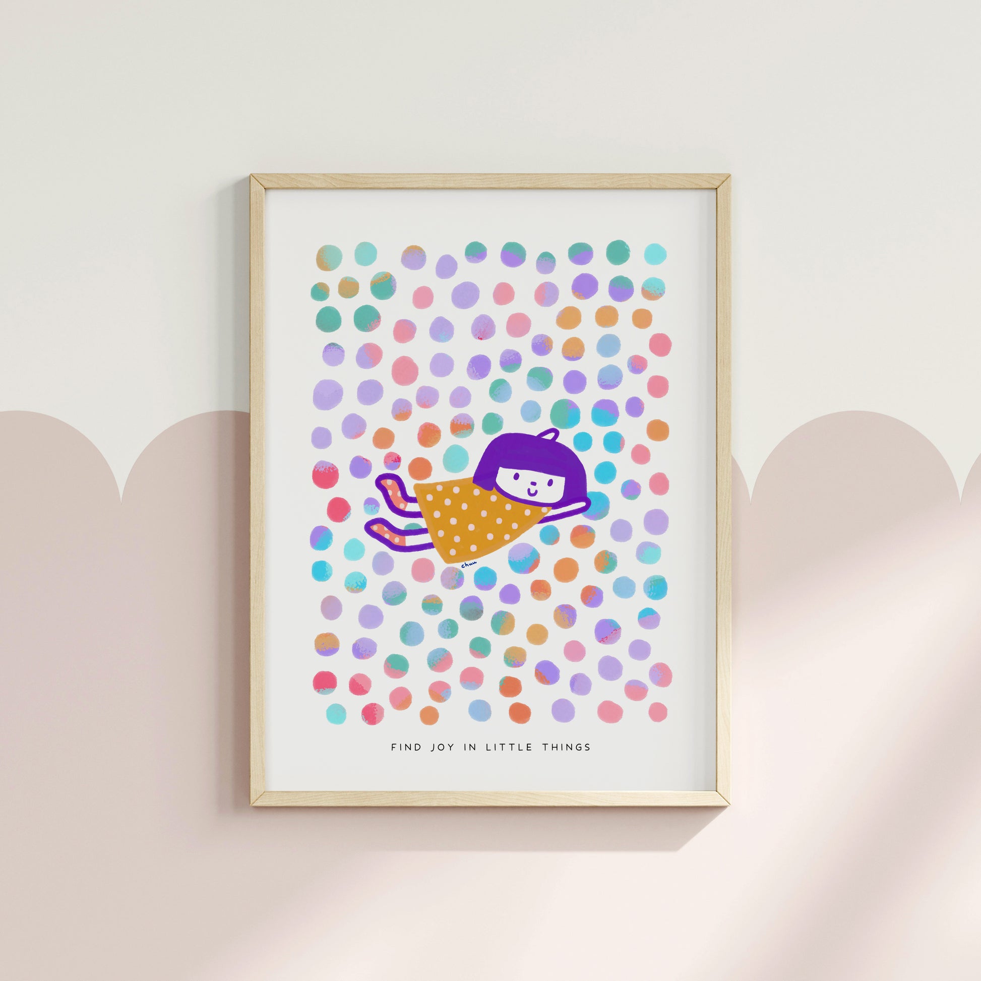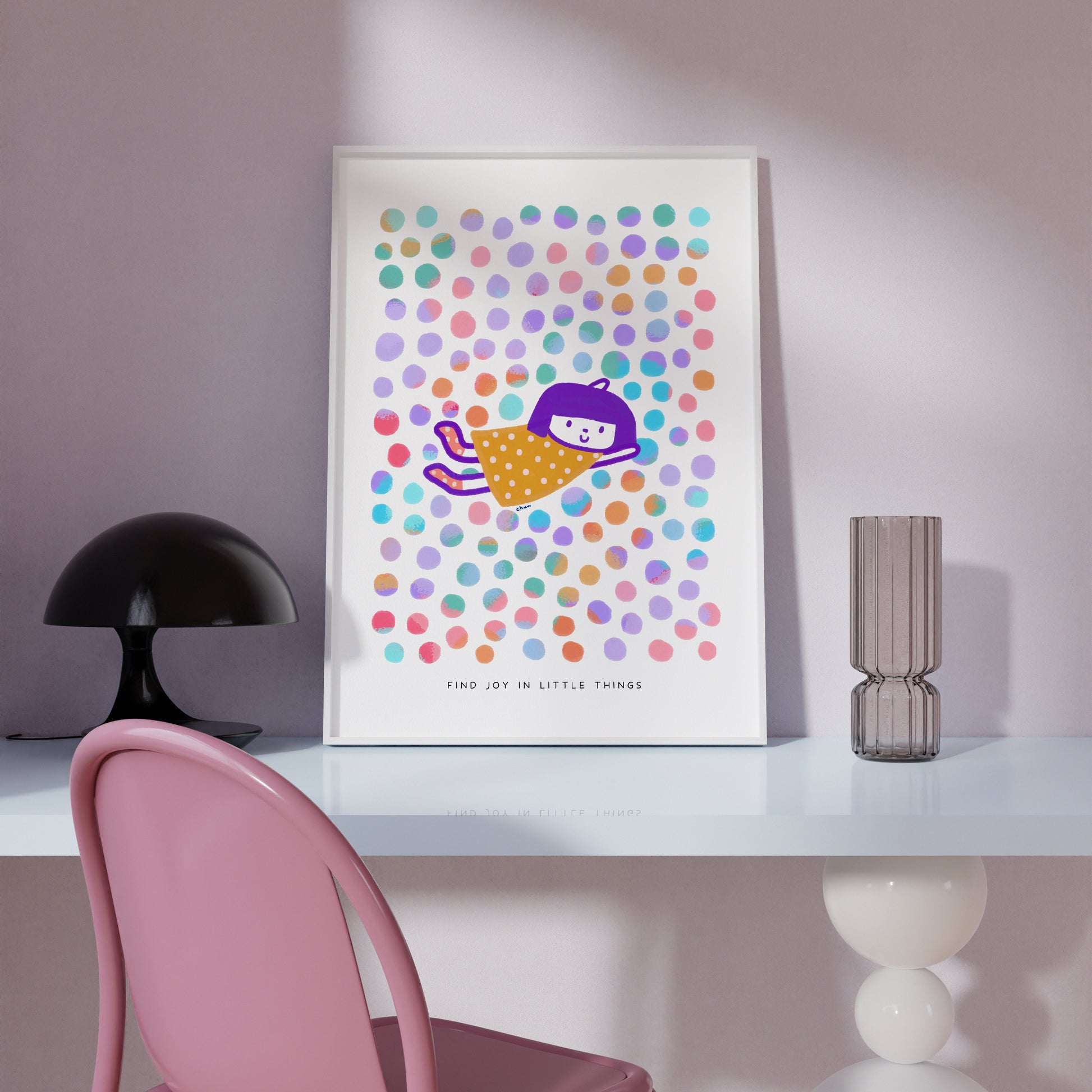 Bring a burst of positivity to your space with the "Find Joy in Little Things" Poster. This high-quality print showcases a playful design featuring a happy girl in an orange polka-dot dress, surrounded by vibrant multi-colored polka dots.
