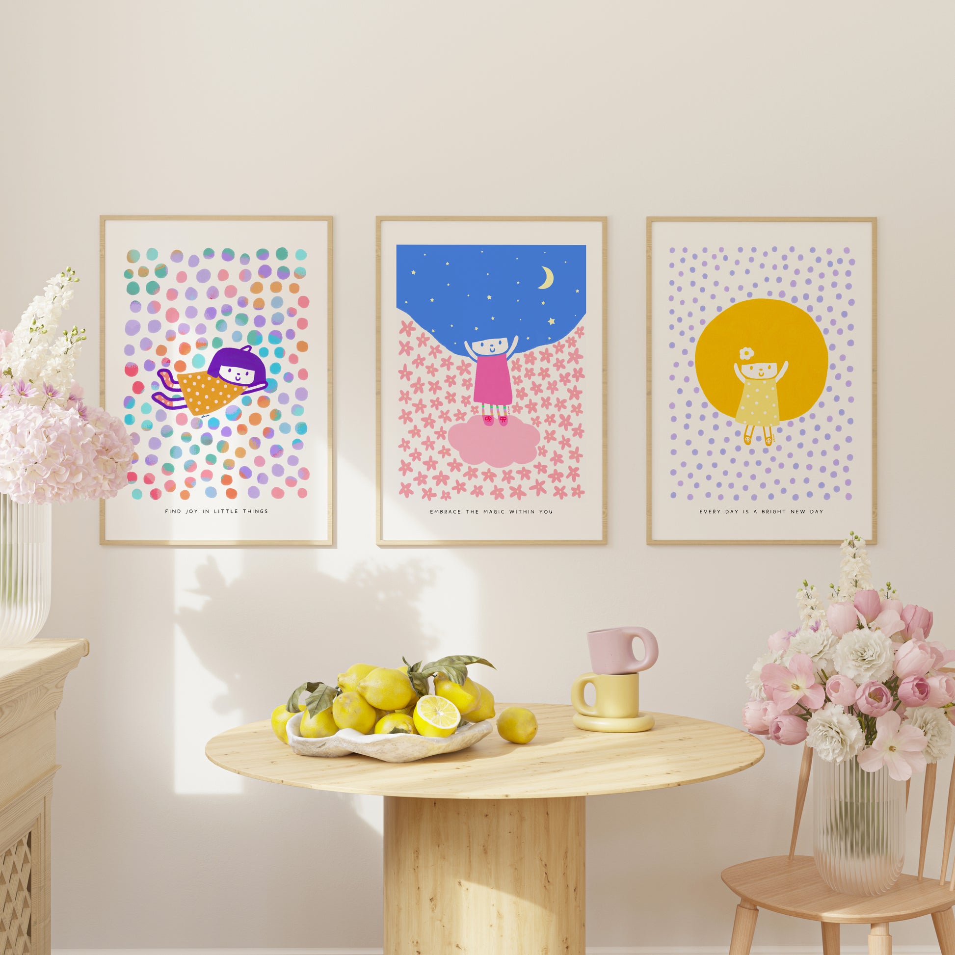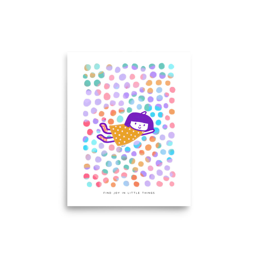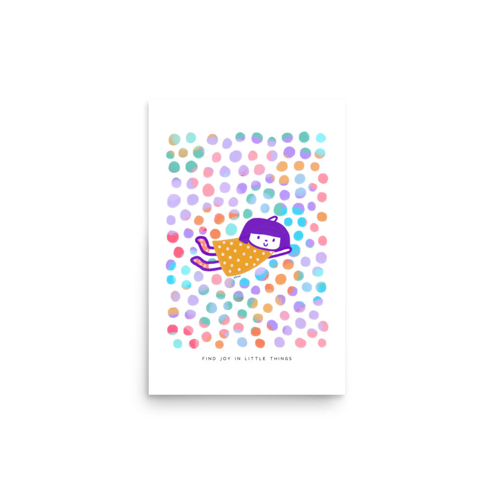 Bring a burst of positivity to your space with the "Find Joy in Little Things" Poster. This high-quality print showcases a playful design featuring a happy girl in an orange polka-dot dress, surrounded by vibrant multi-colored polka dots.