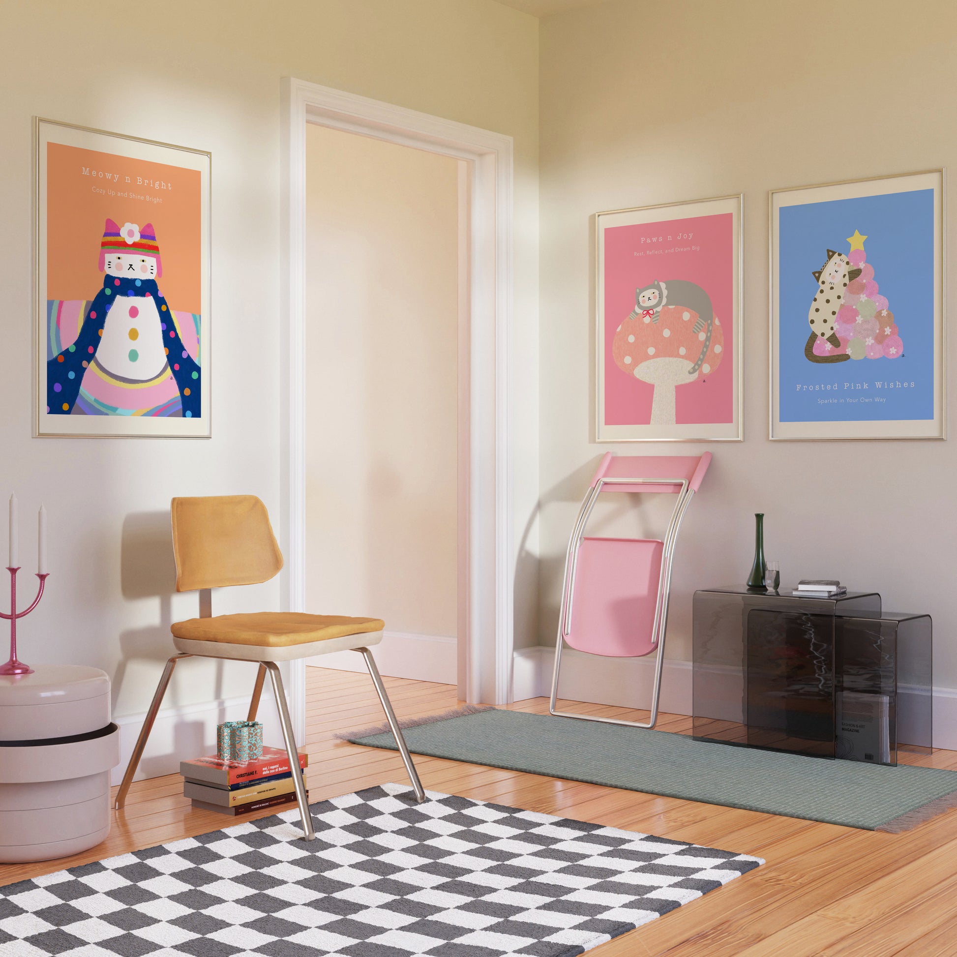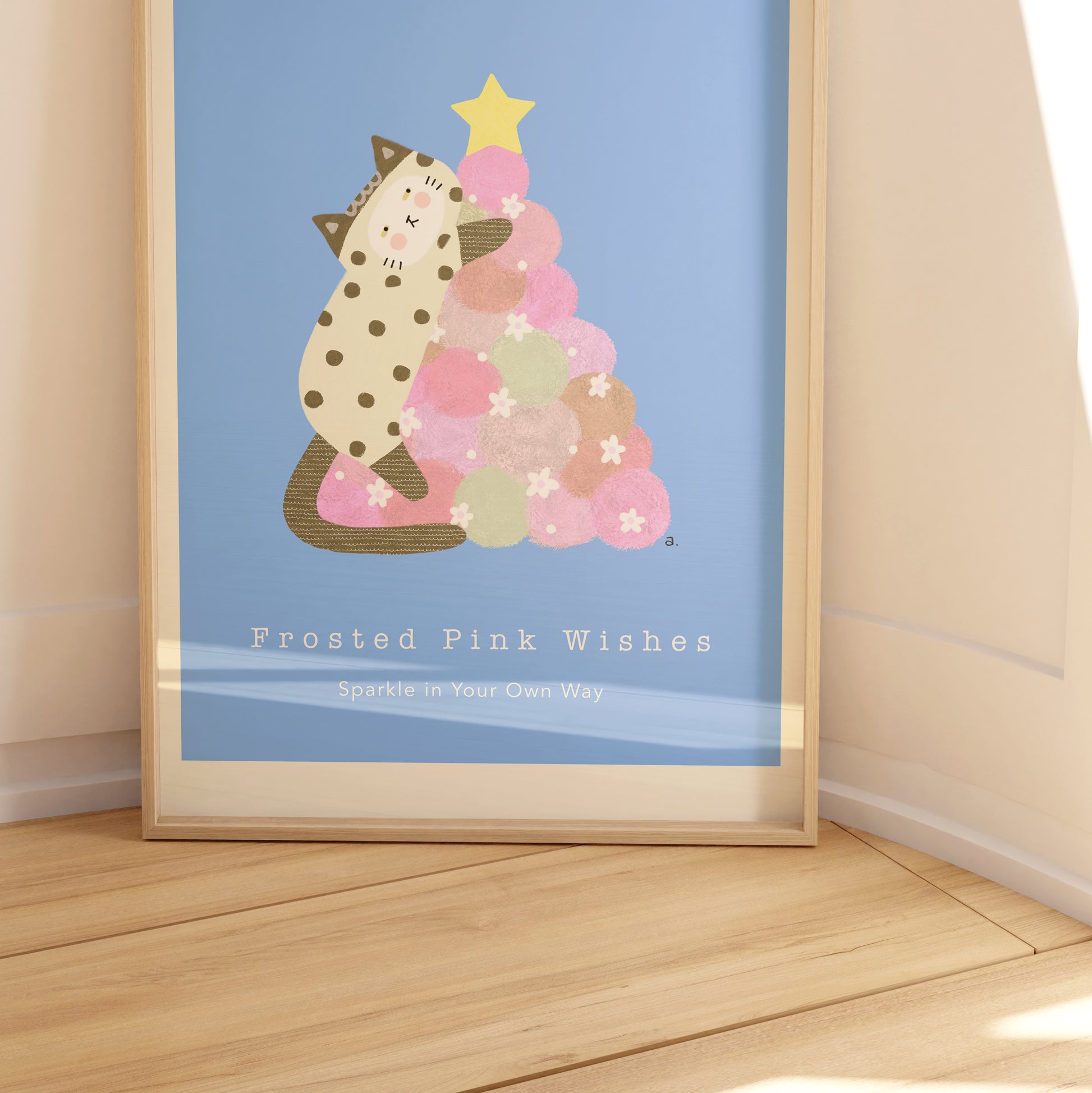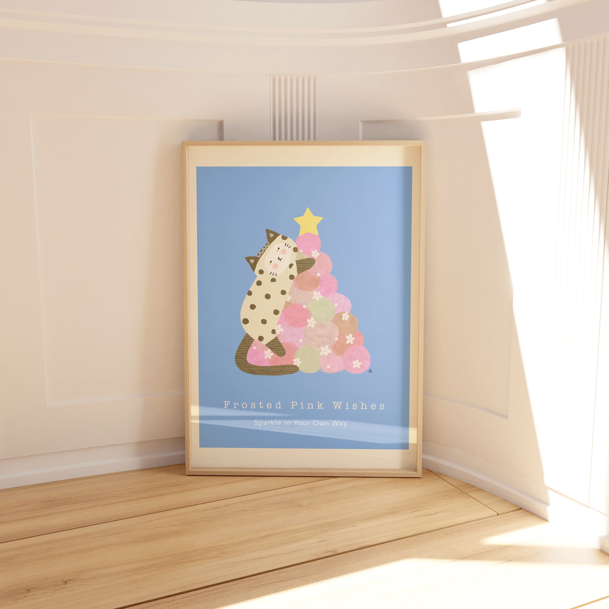 Bring warmth and joy to your holiday season with our Frosted Pink Wishes poster, part of the 'Little Me' collection. Featuring a charming cat embracing a tree of pastel frosted poms with a star on top, this artwork adds a delightful sparkle to any space.