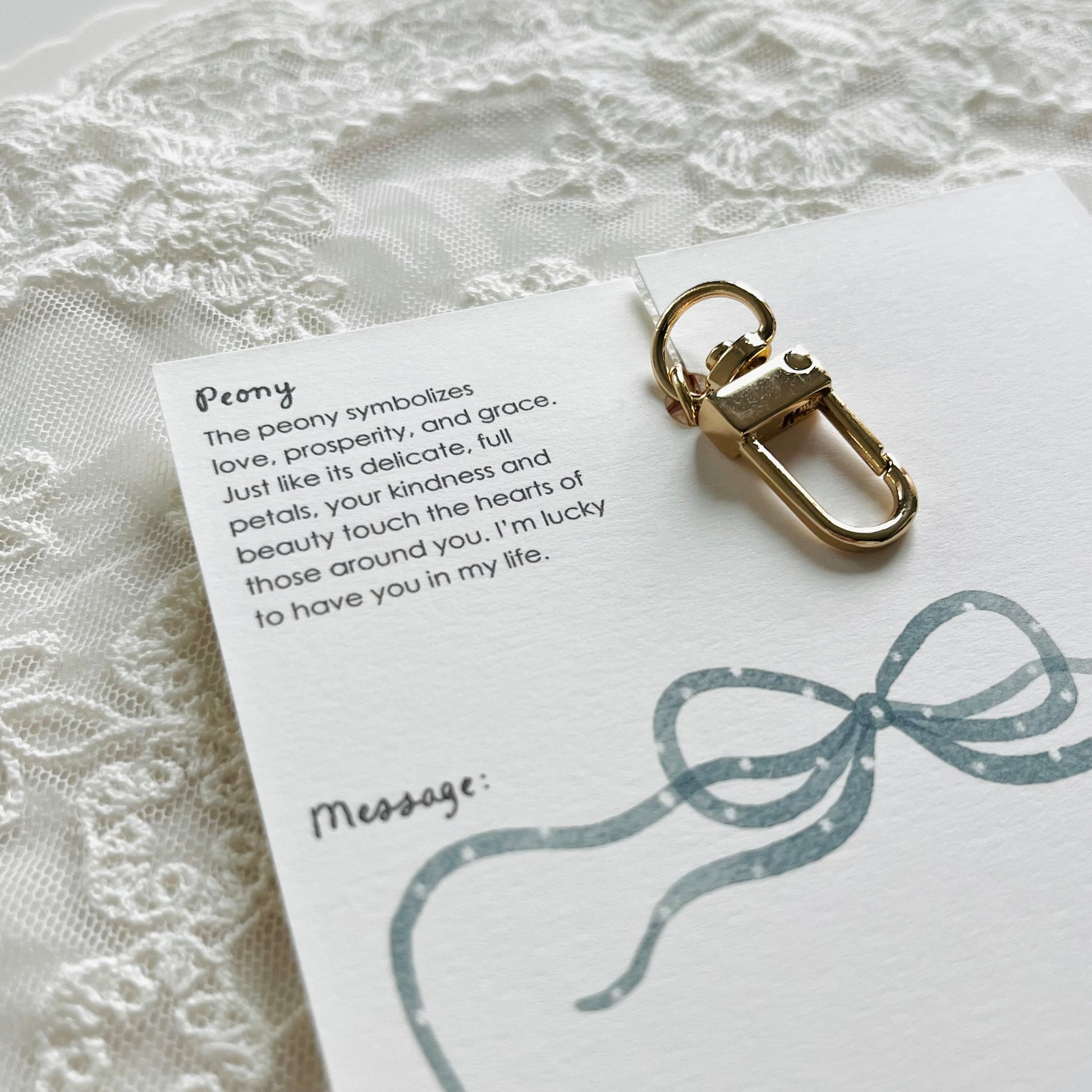 Graceful, tender, and full of charm—the Peony Keychain and Message Card set is a heartfelt way to remind someone just how much their presence means to you. Inspired by the lush beauty of peonies, this set is a gentle celebration of love, prosperity, and kindness.