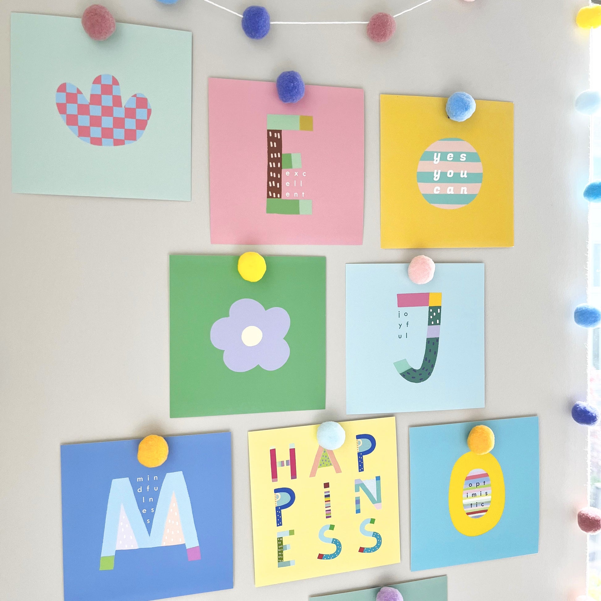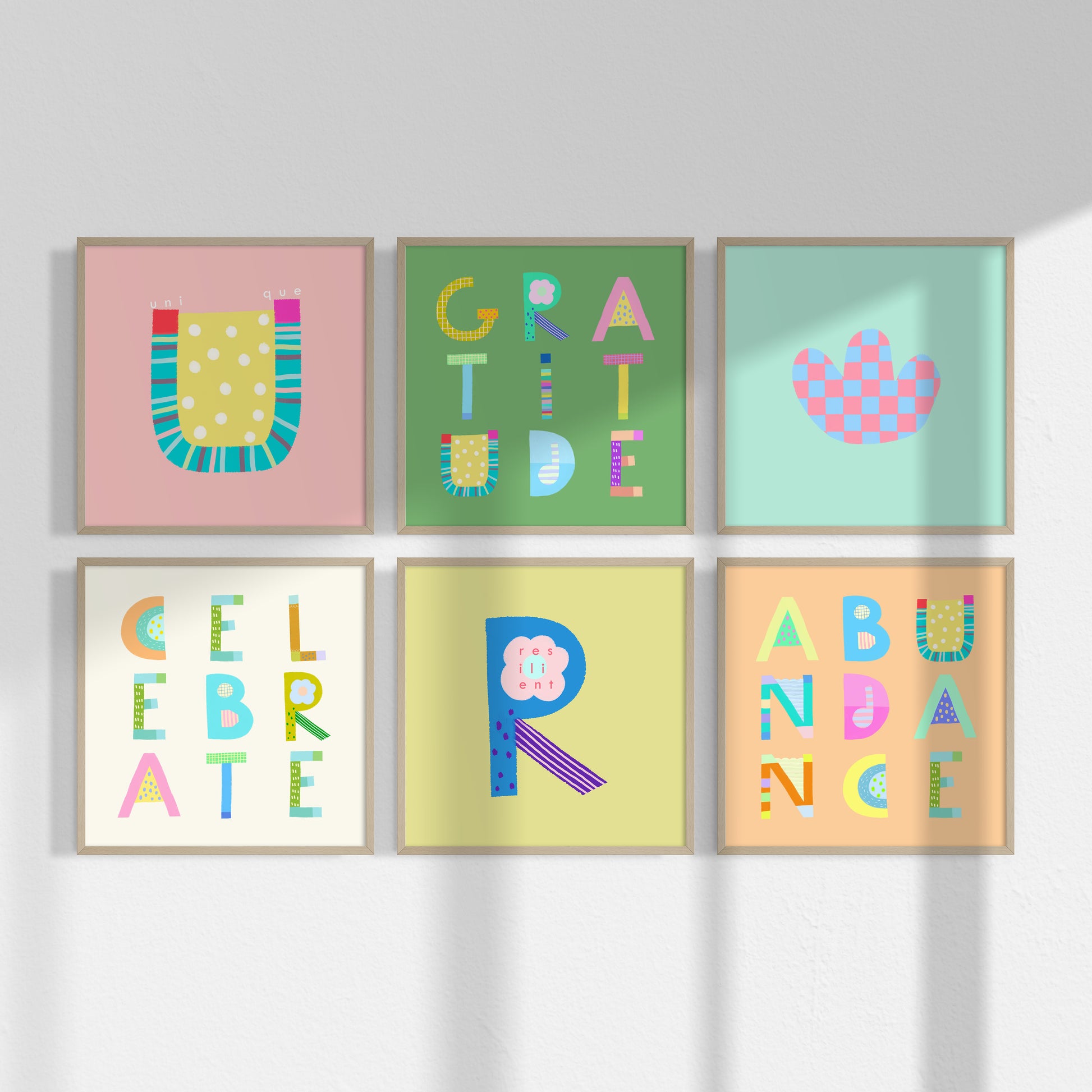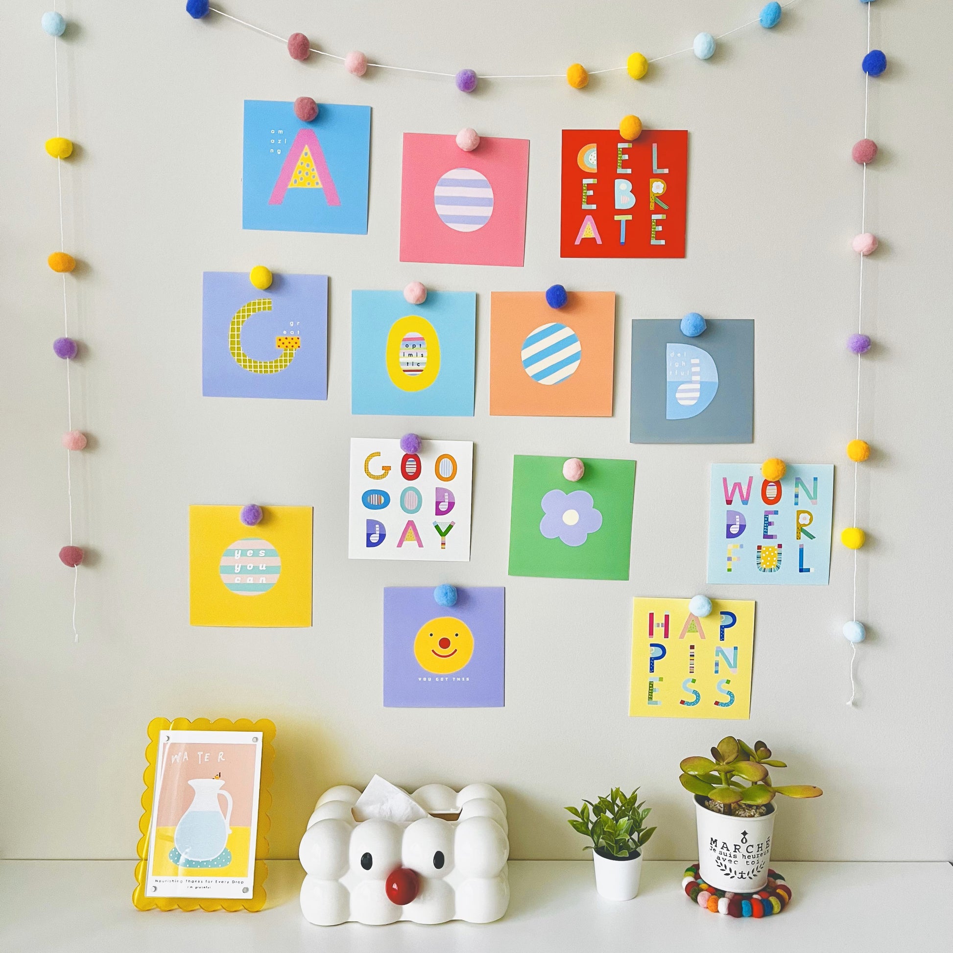 Each card is made with high-quality, durable paper and features eye-catching designs that will make your walls pop! Mix and match to suit your style, whether you want to spell out your favorite words or create a pattern of your choice. These prints come in various themes like "Gratitude," "Celebrate," and "Wonderful," adding a splash of color to your living space.
