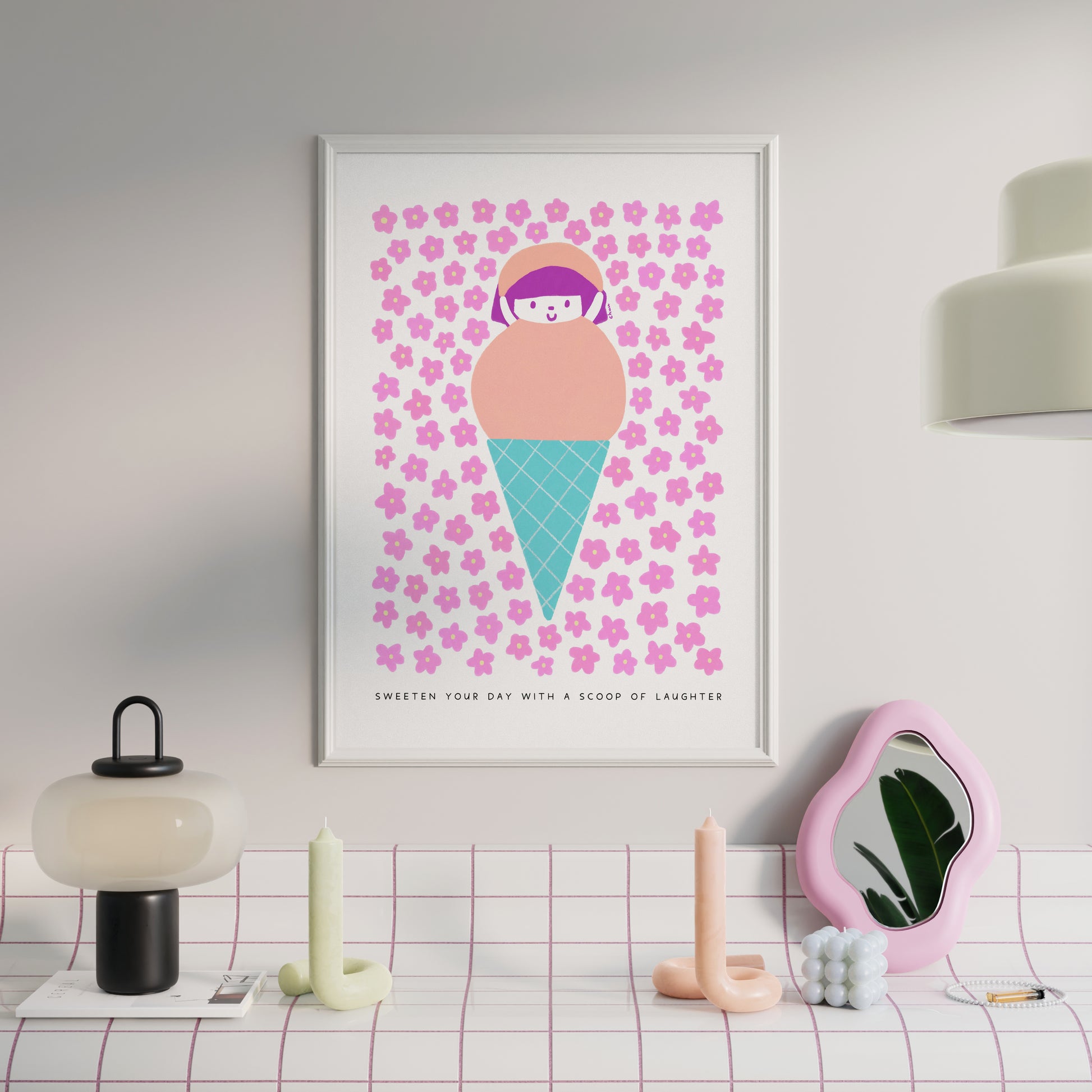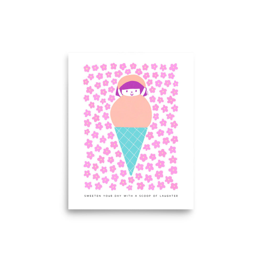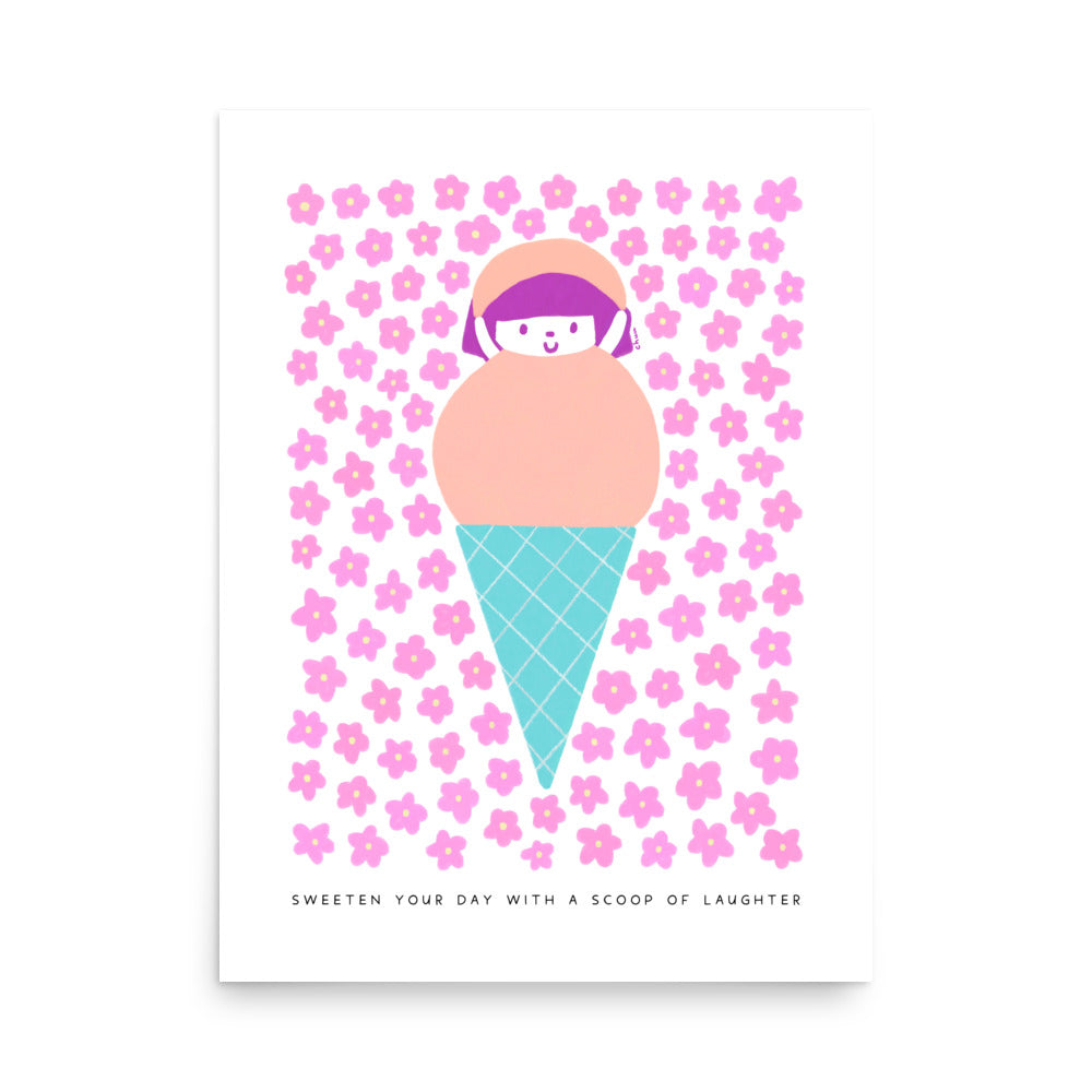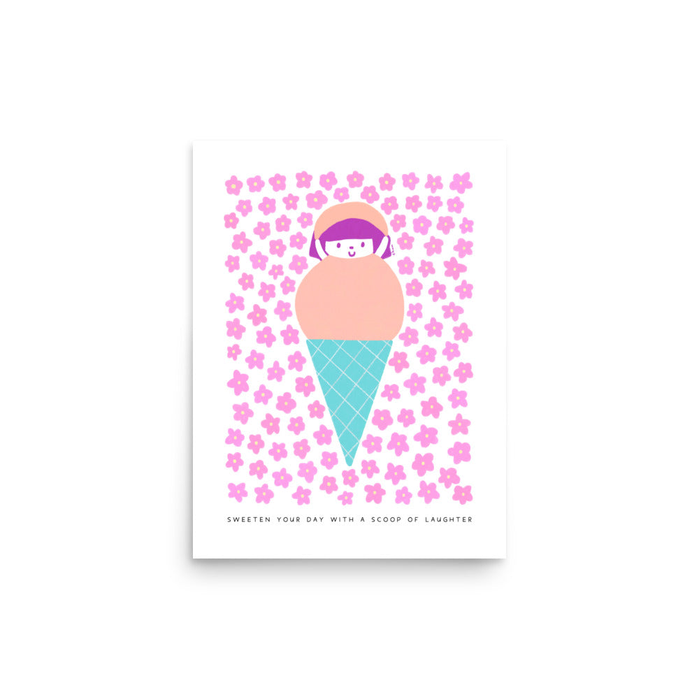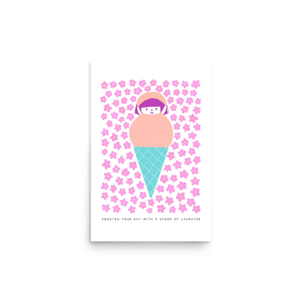 Add a touch of joy to your space with the "Sweeten Your Day with a Scoop of Laughter" Poster. This high-quality print showcases a playful design featuring a cute girl in a peach-colored scoop of ice cream, surrounded by pink flowers.